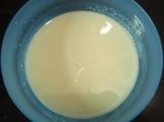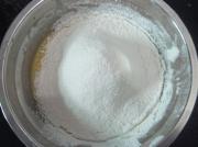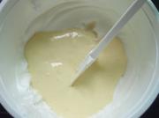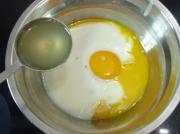 蛋黄里倒入牛奶跟油的混合物、细砂糖、1/4匙柠檬汁打匀。