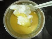 取1/3蛋白加入蛋黄糊中搅拌均匀,然后再取1/3蛋白加入蛋黄糊中搅匀。