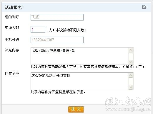 活动时间:2012-11-18 07:45 至 2012-11-18 15:00 报名时间:2012-11-06 20:11 至 2012-11-09 08:00 认证条件:手机认证 活动介绍: 如果青春是一股燃烧的激情,那么,夕阳就是一抹最美的焰火! 落红不是无情物,化作春泥更护花。父母对我们有养育之恩,身边老人对我们有关爱之恩。老年是人生中阅历最丰富的时期,但也是人生中最孤独、最需要关怀的时期。敬老不以事小而不为,助老不以事难而不为。 在日常的社区服务交流过程中,志愿者感受到老人的一些特点:虽然生活艰苦或遭受人生变故,但精神层面尚饱满;虽然因条件所限无法更多的接触社会,但对国家及地区的发展还是相当关注的;有的老人有过不凡经历,曾经行走无数地方;有的老人关心时事,期待更多的面对社会;有的老人闭关自守,与社会格格不入;有的老人尚没有一张属于自己的相片...... “为爱而走—青春与夕阳相伴·我陪老人游家乡”主要内容是组织志愿者陪同老人(孤寡、贫困、残疾、高龄和“空巢”)参观我市著名旅游景区,城市建设的新亮点,新农村建设新成果。通过这些活动让老人感受近年我市经济、社会的发展和进步,感受新农村建设带来的新变化,努力营造帮贫助老、共建和谐的良好社会氛围,让老年人真真切切感受到社会的关爱和照顾。 一、活动主题 为爱而走—青春与夕阳相伴·我陪老人游家乡 二、活动主办单位或支持单位 1、主办单位:情暖湛江志愿者服务队 2、指导、支持单位:湛江团市委 3、协办、资助单位:湛江中粮可口可乐饮料有限公司 4、支持媒体:湛江电视台、《湛江日报》、《湛江晚报》、湛江都市网、《图读湛江》 5、支持商家:美味庄园饼家、现代经典梦幻摄影城、谷丰餐饮管理有限公司、湛江高科商业机械办公设备有限公司 三、活动时间、地点 1、活动时间:2012年11月18日 2、活动地点:湖光岩 海湾大桥 中澳花园 渔港公园 中粮可口可乐公司参观、联谊 四、活动参与人员组成 1、孤寡、贫困、残疾、高龄和“空巢”老人,31人 2、志愿者, 约50人 3、支持单位代表,6人 4、报名截止时间:2012年11月10日16时 五、活动形式 1、游览、参观 2、午餐 3、联谊会 六、活动流程 1、7时45分 霞山位于国贸集中,赤坎位于寸金公园集中,8时出发 2、8时45分—10时45分 湖光岩游览(海洋大学观光) 3、11:10—11:45分 乘车游览渔港公园、海湾大桥、中澳花园 4、12:00—12:45分 中粮可口可乐公司午餐 5、13:00—14:10分 中粮可口可乐公司参观、联谊 6、14:15分送老人回家,15时活动结束 七、活动要求 1、参与活动的志愿者身体健康,男女不限; 3、活动流程经严谨的安排,参加活动人员务必按时到达指定集中地点; 4、参与活动的志愿者务必有爱心,有耐心,喜欢老人并善于沟通; 5、参与活动志愿者统一穿着队服,保持志愿者良好形象; 6、参与活动的志愿者要有团队精神,服从组织者安排,用心服务。活动过程中,志愿者不得随意对老人家做出承诺。服务过程中若有个人行动,应事先知会带队组长; 八、报名须知 1、严格按活动要求人数招募志愿者,特别招募导游、医务、方言、摄影志愿者,请选择组别后跟活动召集帖报名。 组别如下: 1)、陪护组:负责18日活动老人陪护。招募志愿者31+5名(31名正式组员,5名备选人员); 注:霞山接受正式报名志愿者11名,赤坎接受正式报名志愿者20名 2)、摄影组:负责 3)、导游组:负责 4)、应急组:负责 注:报名截止日期为11月10日16时 2、凡报名者视为接受两个确定:一是确定参加 1)8时45分集中,约11时结束; 2)培训地点位于岭南学生接送园(人民大道与文明路十字路口西北向); 3)培训中就活动需要提出要求,布置工作,请自带笔、纸记录。 九、报名方式 点击本报名帖的“ ”按钮报名,有问题可随时联系飞鲨:13620441307。 格式:姓名/区域(霞山或赤坎或服从安排)/组别/方言情况/是否了解活动要求及报名需知 例:飞鲨/赤坎/陪护组/粤语及化州/是 如图: