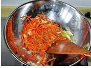 炒锅里炒香葱蒜,加入胡萝卜丝炒香后,加入蚝油、酱油、料酒、盐、味精。