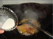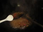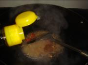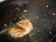 锅里放油烧热(二成热),放入大蒜、辣椒炒香。