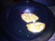 锅里放油,6成热磕入两个鸡蛋煎制。