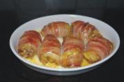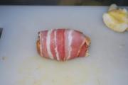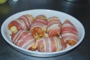 再用一片培根将鸡腿卷包好放入烤盘。