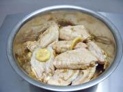 1.鸡翅用牙签扎些小孔(便于更好的入味和保持鸡翅外形的完整),姜切丝,和鸡翅拌匀待用。法香切碎,柠檬挤汁备用,剩下的柠檬空皮囊切片,将柠檬汁、柠檬片与法香连同所有材料和调料一起和鸡翅拌匀,盖上保鲜膜送入冰箱冷藏室腌制2小时以上。