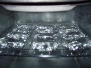 3.鸡翅腌制好后,烤箱提前预热200度,准备锡纸并裁成适当大小的10个小片备用。将冰箱中的鸡翅取出,每个连同一片柠檬片用锡纸包起来,摆上烤架送入烤箱烘烤30分钟。