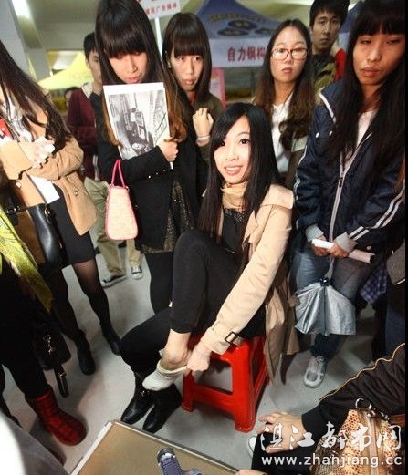 现场最热闹的是一家杰辉产品设计公司招聘摊位,招一名女性脚模,月薪是3500元,吸引了上百名学生上来试脚。
