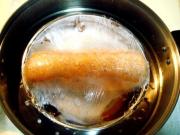 然后下锅开始煎炸,锅要稍有倾斜,保持一边油多一边油少,这样可以把灌肠来回倒换进行煎和炸,光炸也不行,一定要边煎边炸。我这次把灌肠晾的不太透,因此切的不够光滑,灌肠要是凉透后切起来整齐还不易碎。