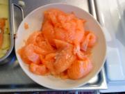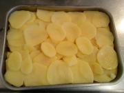放盘先抹一层油,放切好的土豆片一层,在土豆上面放一层三文鱼,撒盐和胡椒粉,蒜粉.再放一层土豆片,再放三文鱼片,撒盐和胡椒粉,蒜粉,这样一层一层的放直到放满方盘.