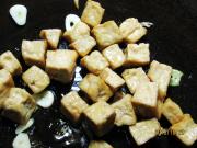 另起锅放油入葱姜蒜爆香,加豆腐丁翻炒。