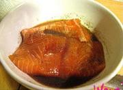 三文鱼加入老抽、黄酒、黑胡椒粉、糖、盐腌制2小时。三文鱼很腥,黄酒要多放。