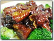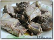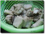 倒入少许料酒,翻炒一会倒入清水,没过排骨,加入三颗的小冰糖,大火烧开。小火慢炖20分钟。