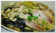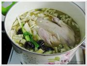 取出鸭子,放入大的沙锅,或者用我这样的汤罐里,下面铺上香菇木耳,莲子,放进鸭子,放入笋干,还有红枣,葱结,适量的盐,少许白糖。