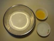 面粉过筛后和蛋黄一起倒入蛋挞水里,搅拌均匀。