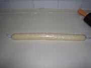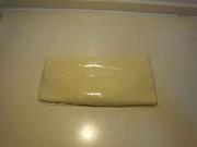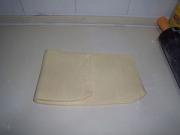 擀好的面片,其宽度应与马琪琳的长度一致,长度是马琪琳宽度的三倍。把马琪琳放在面片中间。