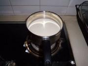 将鲜奶油、牛奶和炼乳、砂糖放在小锅里,用小火加热,边加热边搅拌,至砂糖溶化时离火,略放凉。