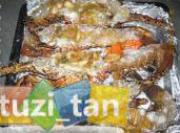 先把龙虾剖开并撒上薄薄一层玉米粉,排在烤盘上。