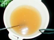 最最关键的一步,给冰镇牛肉烫调味,我们是两碗的冷面的牛肉汤量,是那种专门吃面的碗,如图所示。放了一大调料勺盐,三调料半勺白糖,适量的白醋一定要是白醋,盐和糖的比例是:3.5,各家有碗大小不一样,调完后你要尝一尝,味道是甜酸重味稍咸,搅匀后放冰箱备用。