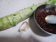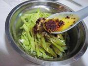 蒜头切碎放在莴笋丝上,调入少量盐、生抽、香醋。