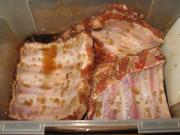 排骨切开3大块(因为我没有大容器放一整块),用叉子在排骨上扎上小洞,以便入味。放入腌料腌1个晚上,中途翻面一两次。
