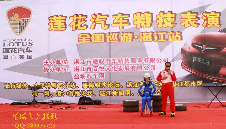 20121226日,莲花汽车特技表演全国巡游湛江站在湛江会展中心举行,主办单位是湛江驰骏汽车销售服务有限公司,支持媒体包括太平洋粤西分站,湛江都市网等。2011年,莲花车队参加全国拉力赛获得冠军,26日当天,莲花车队选手出现在会展中心现场,表演精彩的汽车特技。车队选手上演了速度与激情,可惜我没拍出那个感觉。
