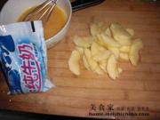 苹果削皮去芯切片,小金瓜(或南瓜)去皮去瓤洗净,用厨房用纸搽干表面水分后切片。鸡蛋加入细砂糖和盐打至稍起泡,加入色拉油搅匀,再分三次加入牛奶,每加一次搅匀后再加下一次,直至完全混合均匀。