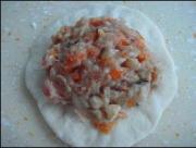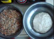 虾仁,红萝卜,冬菇切碎,三七分肥瘦肉剁碎分次加清水搅匀,加入步骤1材料,放胡椒粉,盐,酱油,麻油调味。发酵粉加糖和少量温水调匀,倒入面粉和成面团发酵2个小时。