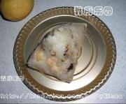 (2)放入少量什锦糯米,然后放入腌肉和咸鸭蛋黄;