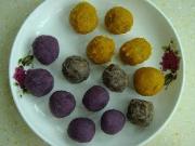 紫薯高压锅蒸10分钟,压成泥,加白糖,少量面粉团成小丸子;