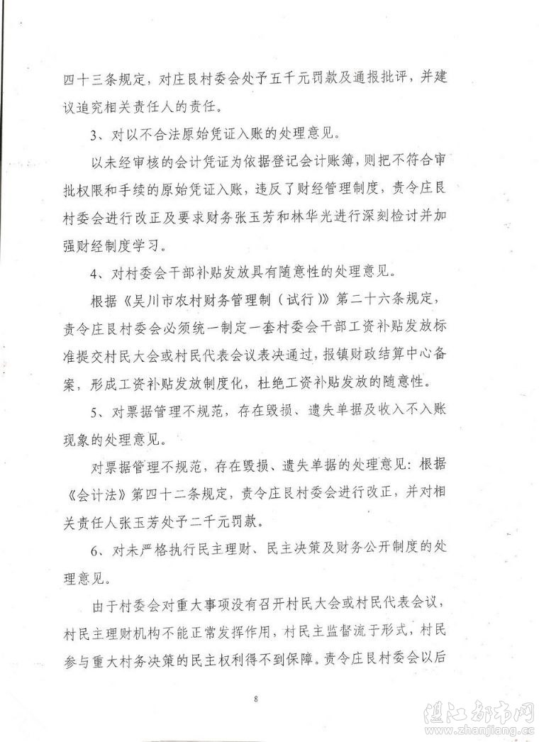 事件经过:吴川市财政局于2012年4月28日审计的“庄艮村2008年1月至2011年4日财务收支情况”结果(详见附图),证实张玉芳、林建华等人存在以下严重问题。