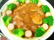 倒入炒好的土豆、鲜蘑。放入西兰花、火腿。