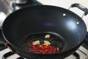 锅中倒少量的油,因为熏肉本身含有油脂,过油的时候还会炼出一部分的油来,所以不能放太多,油温至八成热时下入生姜,干尖椒炒香。