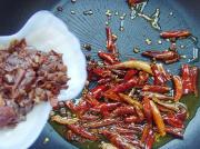 倒入干辣椒和豆瓣酱,炒出香味和红油。