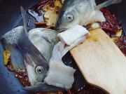 倒入鱼头、尾、鱼骨炒匀。