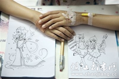 在廉江市安铺镇有位17岁地贫女孩,从3岁开始就爱上漫画,在她坚强的笔下,已不知画了多少张、多少本。因为患病的缘故,她从六年级就休学在家。由于错过了干细胞移植的机会(骨髓移植),10几年来都是靠每月输血与去铁等保守治疗来维持生命,也因为贫血的因素导致脾脏增大,现脾脏大已影响到无法正常行走与自理生活,唯一的办法就是做去脾手术,但手术的用血量是很高的,需要3000cc。目前医院血库供不应求,必须要有相关人员进行互助献血才可以为这名地贫女孩解决手术用血问题,现在此向湛江有心人帮助一下这位有理想、有梦想的地贫女孩,她名叫王蕴钰。 昨天中午和嘟嘟等几位朋友一起去赤坎中心人民医院看望地贫少女。