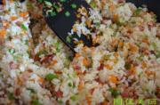 腊肉上锅蒸10分钟,放凉后切成肉末。青椒胡萝卜切成小丁,小葱切成末。