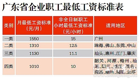大年初一前五天,广东宣布将调高最低工资标准。从广东省人社厅了解到,省政府决定从今年5月1日起调整企业职工最低工资标准和非全日制职工最低工资标准(深圳除外)。其中第二类地区珠海、佛山、东莞、中山提高至1310元/月;第三类地区汕头、惠州、江门、肇庆提高至1130元;第四类地区湛江、茂名、阳江、韶关、河源、梅州、汕尾、清远、潮州、揭阳、云浮十一市,提高至1010元。