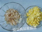 鸡蛋炒熟后切碎;虾皮用温水泡5分钟,攥干水分。