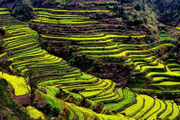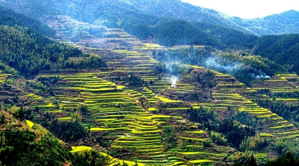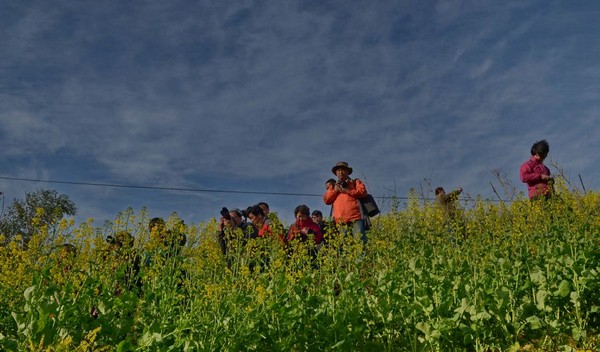 江岭,因上世纪90年代香港著名摄影师陈复礼一幅江岭“天上人间”作品获国际金奖而名扬天下。到婺源不到江岭看油菜花梯田等于没到婺源。我们从江岭游客中心验票进去后直奔一号观景台,一号观景台距验票入口很近,大概只有200米左右。到了观景台发现早有大批摄友架着长枪短炮对着大片的梯田扫射。可惜此时的江岭天气阴沉,而且有雾,这等复杂天气下,向我这等摄影菜鸟如何能拿住,只好望景生叹,无可奈何。