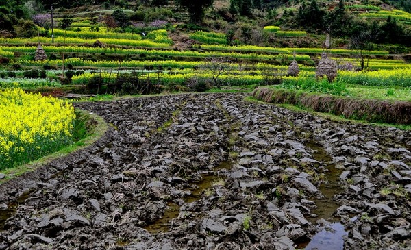 常听人抱怨天气预报不准,国家的那些气象卫星都是白放的,气象台的哪些专家都是吃干饭的,俺以前也信,但现在俺不信了,俺要郑重的、庄重的、严肃的声明,国家的哪些气象卫星绝不是白放的,气象台的专家绝不是吃干饭的,我们的天气预报不但准而且准的离谱。30日,气象预报婺源有雨,果然,从30日的凌晨雨就开始疯狂的下了起来,这么准的预报我想应该已经超过西方发达国家的水平了吧。凌晨4点多醒了,听着窗外哗哗的雨声,就知道不用早起了,还起那么早干什么呢?拉个大灯泡充日出吗?这能是我们这等成熟人士能够干的出的!睡吧,睡吧,虽然沮丧的没了睡意,但我们还是在床上坚持到7点多才起来,吃过早饭,打着伞到外面转了一下,雨一点没有停的意思,反倒有点越下越大了。不过还是有不少游人打着伞、穿着雨披在花田小径上漫步,也有一些摄友扛着相机冒雨创作,还有的摄友旁边还专门有帮忙打伞的,羡慕ing。