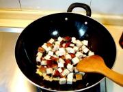 葱姜煸香后,下入熏干儿继续煸炒。