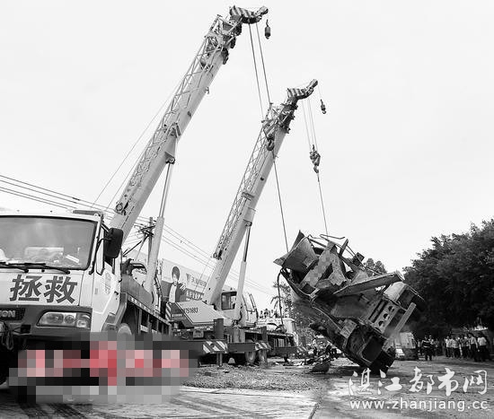 昨日下午,赤坎康强路发生车祸,两辆拯救车正吊起肇事车辆。