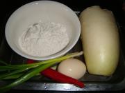 白萝卜擦丝,蒜叶切段,红椒姜切成小粒。