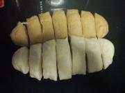 另一个颜色的面团也一样擀平,大小差不多,将做法9放在上面。