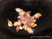 起油锅,爆香蒜头,下酱肉煸炒。