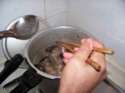 高压锅排气后将汤里的血沫捞起。