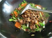 把炒好的羊肉片加入锅中,翻匀,加鸡精盛出。