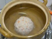 沙锅里放一半的清水(要末过肉丸的三分二),加两片姜,烧快烧开的时候,把肉馅揉成个大肉丸放进锅里,用中上火炖25分钟左右。然后把肉丸捞起。