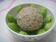把切好的胡萝卜粒和莲藕末,姜茸倒进肉末里,加生粉顺同一方向把所有材料搅拌均匀起劲。