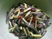 腌制。用盐8克、花椒50粒、大料2粒、姜丝、干辣椒、料酒。腌制数小时(最好半天时间,这样比较进味)。