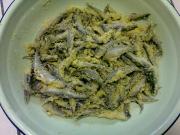 将买回来的小麦穗鱼一条条的收拾干净(去腮、去内脏、去鳞),洗净备用。